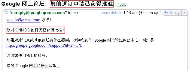 但,Google明显就有着不少态度不行的人,比如我今天收到的Google论坛的一封订阅邮件,标题竟然是“您的退订申请已获得批准”: