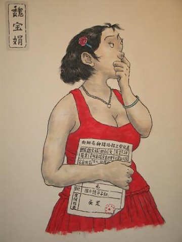 这些画儿,其实还挺讲究,有的一幅画就是一个故事,再一琢磨,里边一些人名啥的,细一想,可有意思了,比如这个魏宝娟,谐音是“喂饱圈”,意思是,养猪时,喂饱了就得赶紧圈起来,长膘。她手里拿的“向阳屯种猪场招工登记表”上,有何特长,写着“头发”。