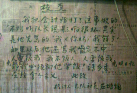 我把会计给打了,这事做的不对。听队长说影响很坏,其实是他先骂的‘我x你妈!’我错了!如果以后他还骂我,肯定不中。人不饭我,我不饭人,人要饭我,那我必须向他要饭!请乡委会给拿个主义。此致