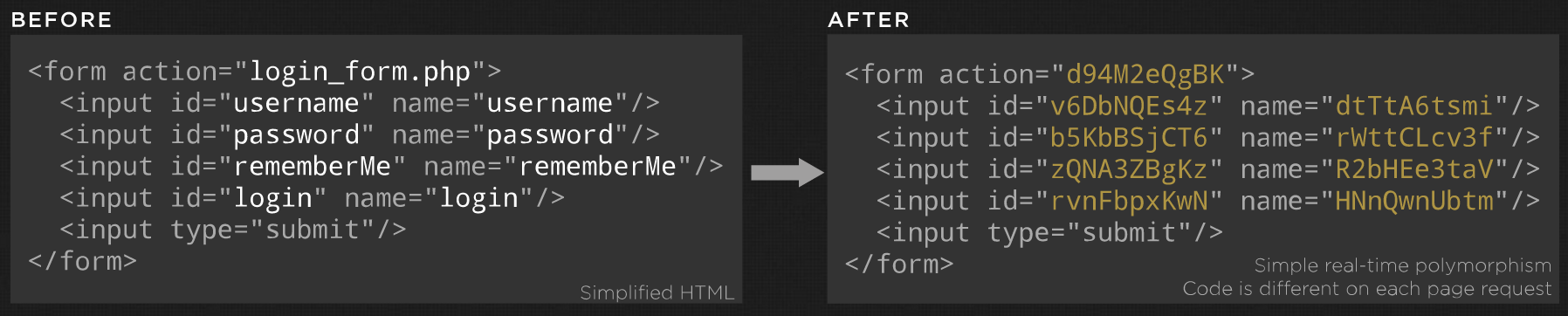 ShapeShifter是硬件网站安全防御产品,主打理念是「代码变形」,每个用户每次看到的界面一样,但是程序代码自动变形,简单原理图如下: